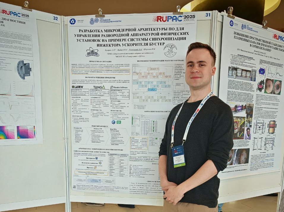 Тема его стендового доклада – «Разработка микроядерной архитектуры по управлению разнородной аппаратурой физических установок на примере системы синхронизации инжектора ускорителя БУСТЕР».