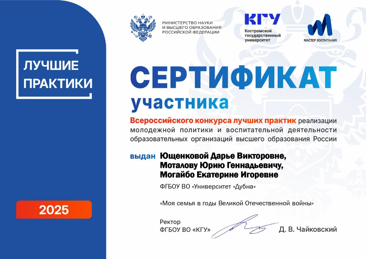 Проект ГУД «Моя семья в годы Великой Отечественной войны» получил высокую оценку на Всероссийском конкурсе лучших практик молодежной политики и воспитательной деятельности.