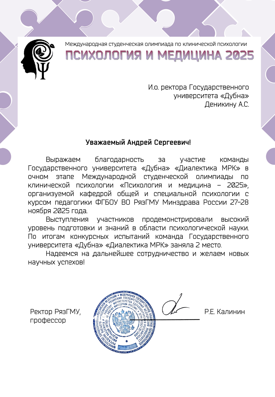 Отмечая высокий уровень подготовки наших студентов, организаторы конференции направили в адрес ректора ГУД Андрея Деникина благодарность за выступление команды Международной олимпиаде по клинической психологии «Диалектика МРК»: